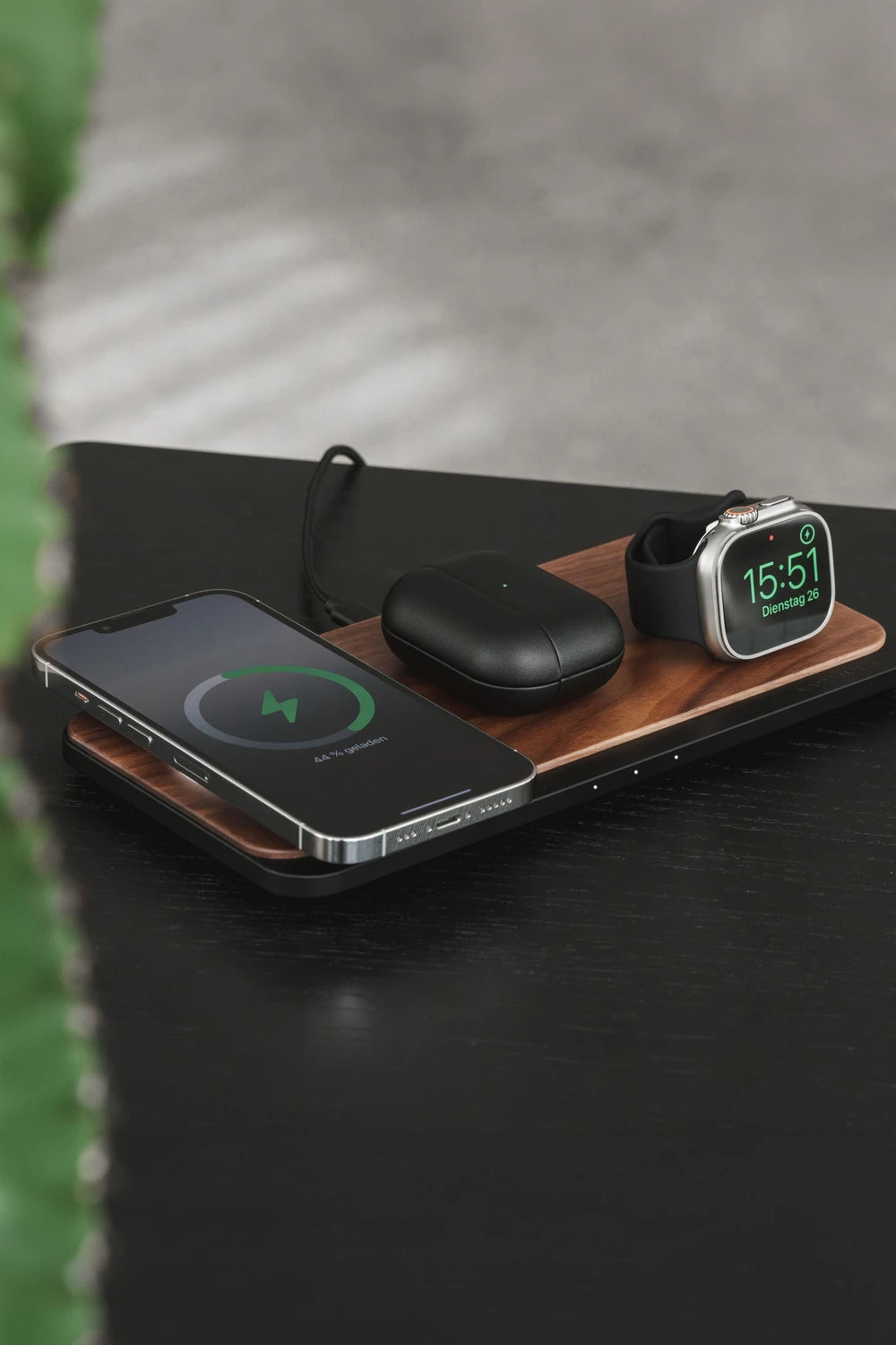 La station de recharge pour Apple Watch n'est pas seulement un outil utile - elle fait partie intégrante de ton intérieur. Nos stations de recharge s'intègrent parfaitement dans ton intérieur grâce à leur combinaison harmonieuse de technologie et de design et deviennent ainsi un véritable point de mire qui souligne ton style personnel. La sélection minutieuse de matériaux haut de gamme tels que le bois dur et l'aluminium recyclé ne reflète pas seulement ton sens de l'esthétique, mais souligne également ton engagement pour l'environnement. Le charme naturel du bois et le métal robuste mais élégant forment un ensemble séduisant, à la fois fonctionnel et sophistiqué. Avec la station de charge Apple Watch et grâce aux bases magnétiques MagSafe© intégrées et à la fermeture rapide par encliquetage, tu bénéficies non seulement d'un confort incomparable, mais aussi d'une excellente sécurité pour tes appareils. La fonction qui te permet de charger simultanément ton iPhone, tes AirPods et ton Apple Watch lorsque tu utilises la MultiBase Pro est particulièrement pratique - et ce avec une puissance totale pouvant atteindre 30 W.