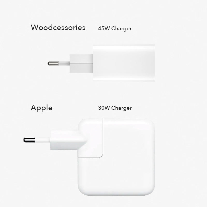 Avec ce Chargeur de 45 watts ton appareil sera de nouveau prêt à l'emploi en un rien de temps ! Le site USB-C-Adaptateur secteur avec 45W Puissance charge 50 % de ton iPhone en 30 minutes ! Avec la toute dernière Technologie GaN tes appareils sont protégés contre les surtensions et les surchauffes ! Recharge rapidement avec notre chargeur compact Chargeur rapide USB-C! Le complément parfait de notre Magsafe 3 en 1 © & Apple Watch Charger !