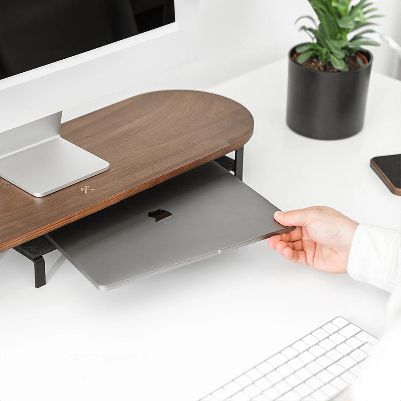 Le noyer et le chêne sélectionnés, associés à une base en aluminium recyclé mat, confèrent à ce support pour écran un design durable.
