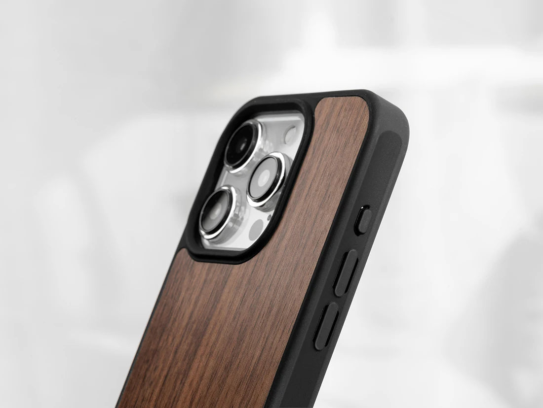 Notre unique Bumper Case en bois de noyer de haute qualité. La coque iPhone 15 Pro en bois et silicone recyclé, fabriquée à la main, protège ton iPhone contre les chutes jusqu'à 2 m de haut ! Reçois un véritable morceau de nature avec un veinage tout à fait individuel.