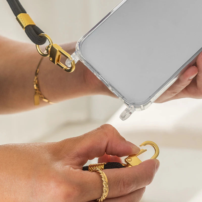 Grâce aux mousquetons dorés, tu peux accrocher et décrocher ton cordon Classic.