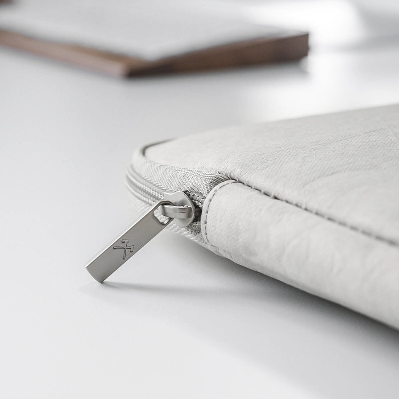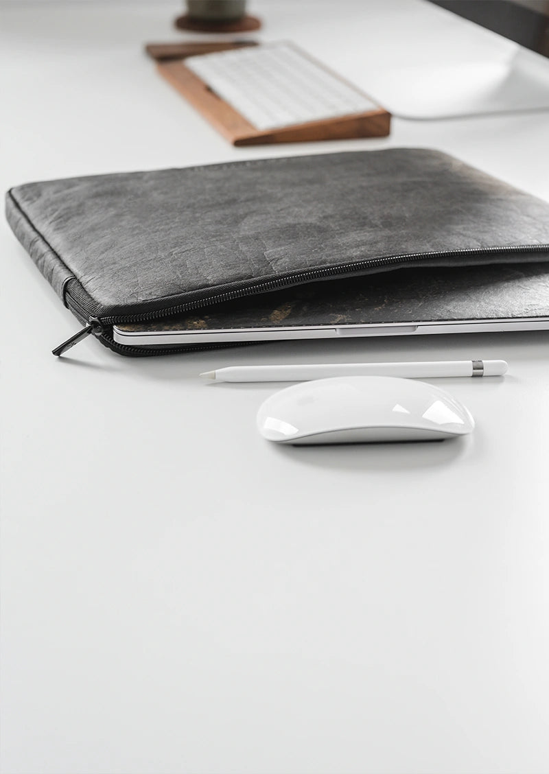 Notre housse pour MacBook est fabriquée à partir de papier kraft allemand Texon Vogue®, composé à 100 % de pâte de bois naturelle. Ce matériau durable est certifié FSC® et OEKO-TEX®, ce qui nous permet de garantir à la fois le respect de l'environnement et l'absence de substances nocives. Il est également très résistant, imperméable et peut supporter une utilisation prolongée en extérieur. L'aspect et le toucher du cuir de haute qualité en font une alternative verte parfaite.