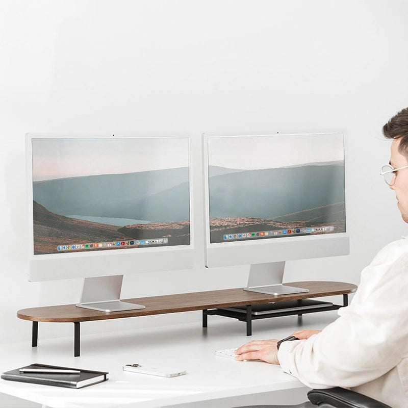 Grâce au support d'écran en bois et aluminium certifiés, il est encore plus facile de travailler de manière efficace et ergonomique ! Le rehausseur d'écran allie fonctionnalité et esthétique, tout en offrant un espace de rangement pratique grâce à la tablette optionnelle ! Élargis ton poste de travail avec le rehausseur d'écran stable et optimise ta configuration de bureau !