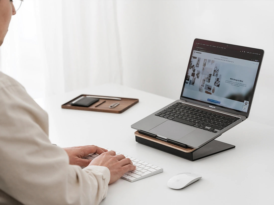 Le support pour ordinateur portable est fabriqué à partir de matériaux de haute qualité, comme du bois massif américain de qualité supérieure et de l'aluminium recyclé avec une surface anodisée. Nous créons ainsi un produit de haute qualité et pouvons garantir une stabilité et une résistance à long terme du matériel.