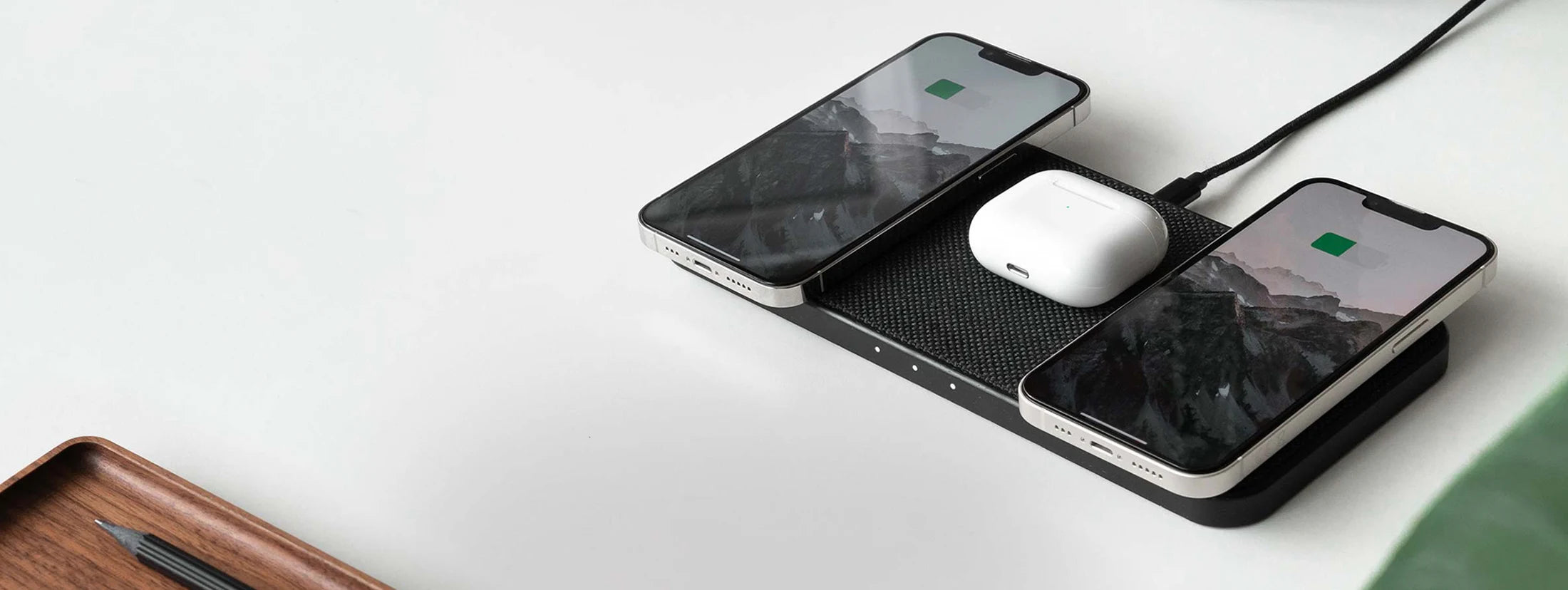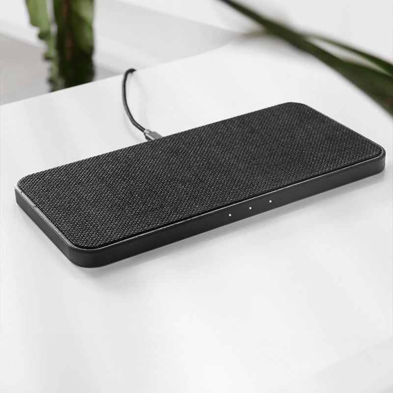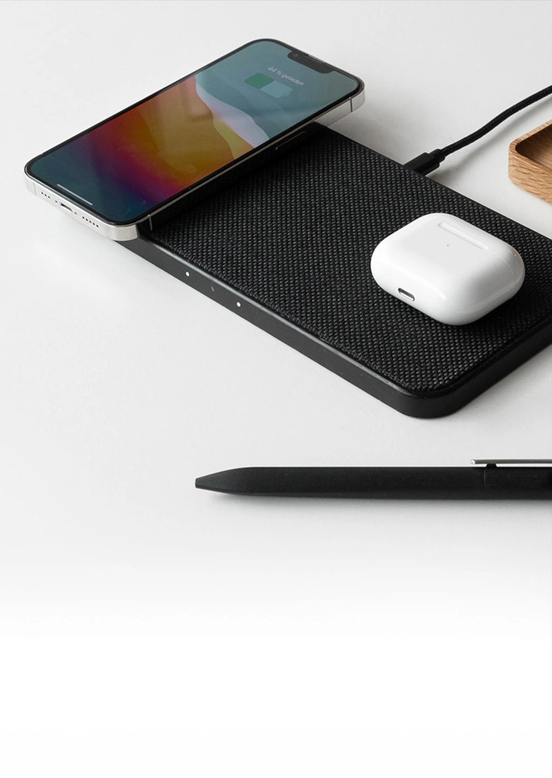 Chargement minimaliste et élégant avec notre station de charge 30W Premium en bois & tissu de l'édition limitée Black ! Avec les 3 zones de chargement, tu peux charger simultanément des smartphones et des AirPods, et ce avec un Fast Charging pouvant atteindre 15 W ! Grâce aux lumières LED discrètes, tu as toujours une vue d'ensemble sur le processus de chargement !