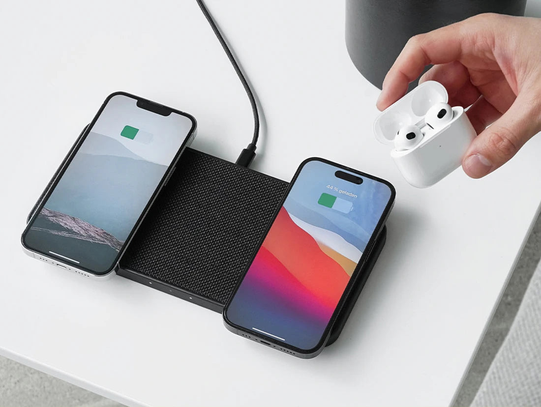 La condition technique pour utiliser la station de charge inductive est un Adaptateur secteur avec une puissance suffisante. Tu devrais utiliser un Adaptateur secteur (Power Adapter) avec au moins 30W. Bien sûr, tu peux aussi utiliser des blocs d'alimentation plus puissants, comme 45W ou 60W. Dans notre test, nous avons utilisé notre Multi Wireless Charger avec notre 30W Fast Charging Adaptateur secteur et l'avons testé avec un iPhone 13 Pro. Dans ces conditions, tu peux charger 50% de la batterie de ton smartphone en moins de 60-70 minutes. Bien entendu, le temps de charge de ton appareil compatible QI dépend également d'autres facteurs, tels que l'état de la batterie, la température et d'autres circonstances extérieures.