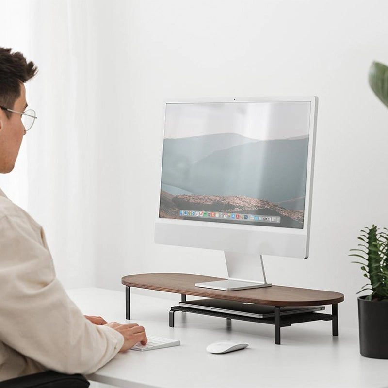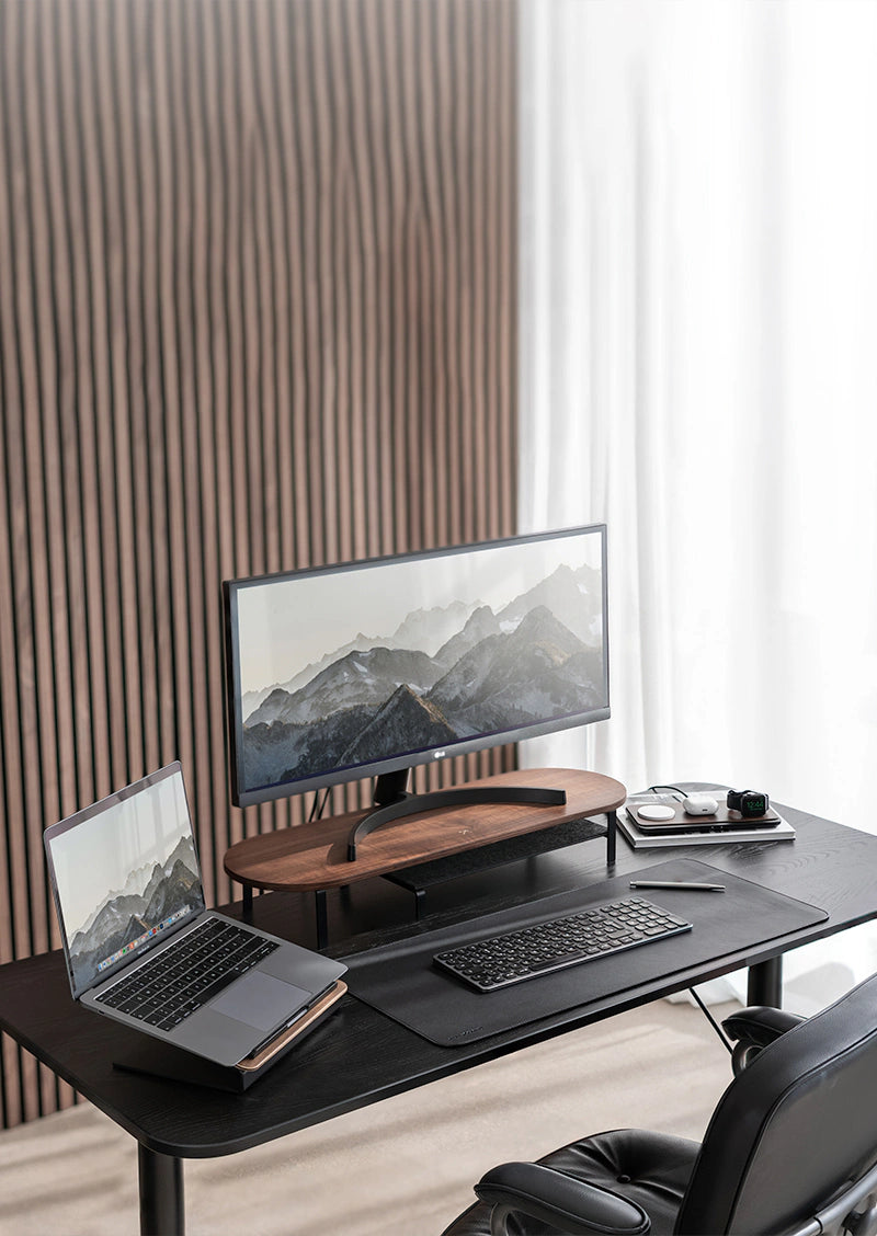Le noyer et le chêne sélectionnés, associés à une base en aluminium recyclé mat, confèrent à ce support pour écran un design durable.