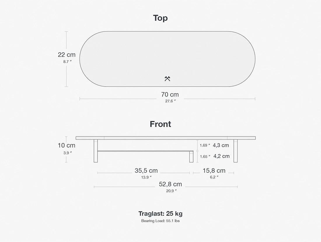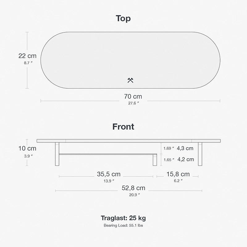 Nos supports pour écran mesurent 70 x 22 cm avec une hauteur de 10 cm. La distance entre les pieds est de 52,8 cm. La tablette a une hauteur de 4,2 cm et une longueur de 35,5 cm, ce qui permet d'y poser un ordinateur portable ordinaire et des documents.