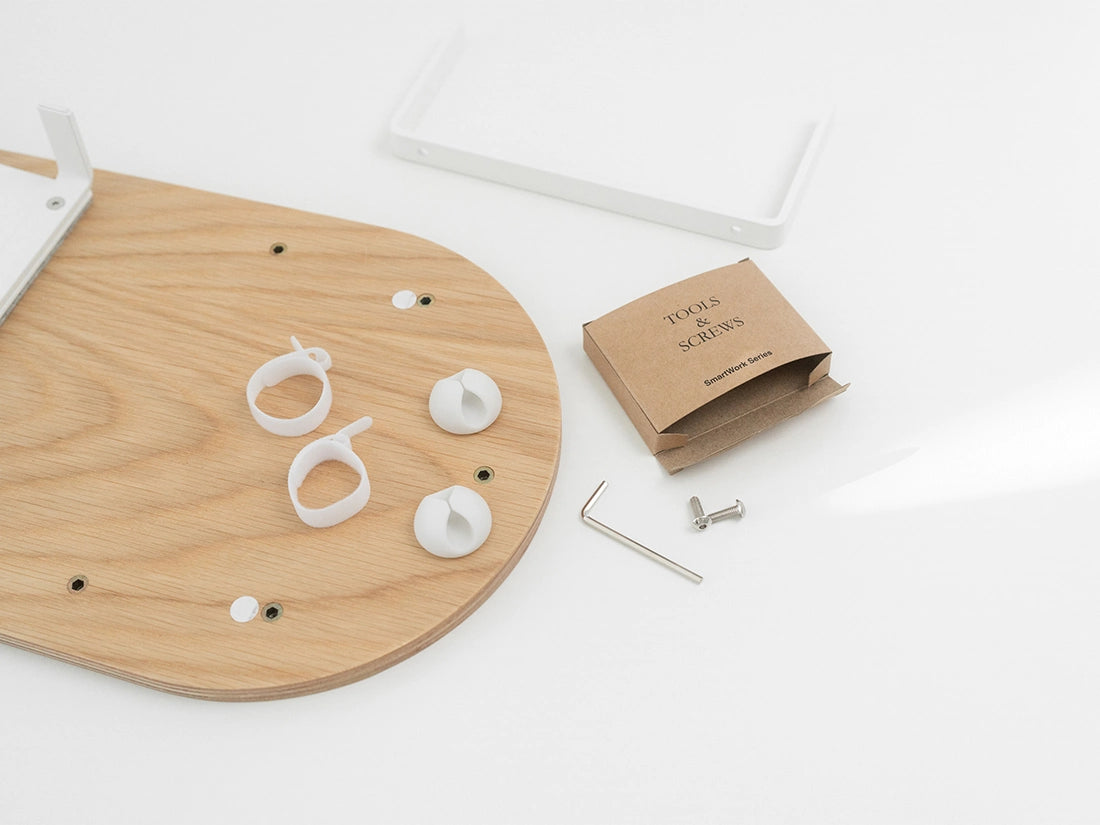 Tu peux facilement assembler ton support d'écran à l'aide des accessoires fournis. Les pieds en aluminium sont fixés à la planche à l'aide de vis et d'une clé Allen, ce qui permet de les retirer sans trop d'efforts. Tu trouveras également dans ton paquet un mode d'emploi qui t'aidera à le faire.